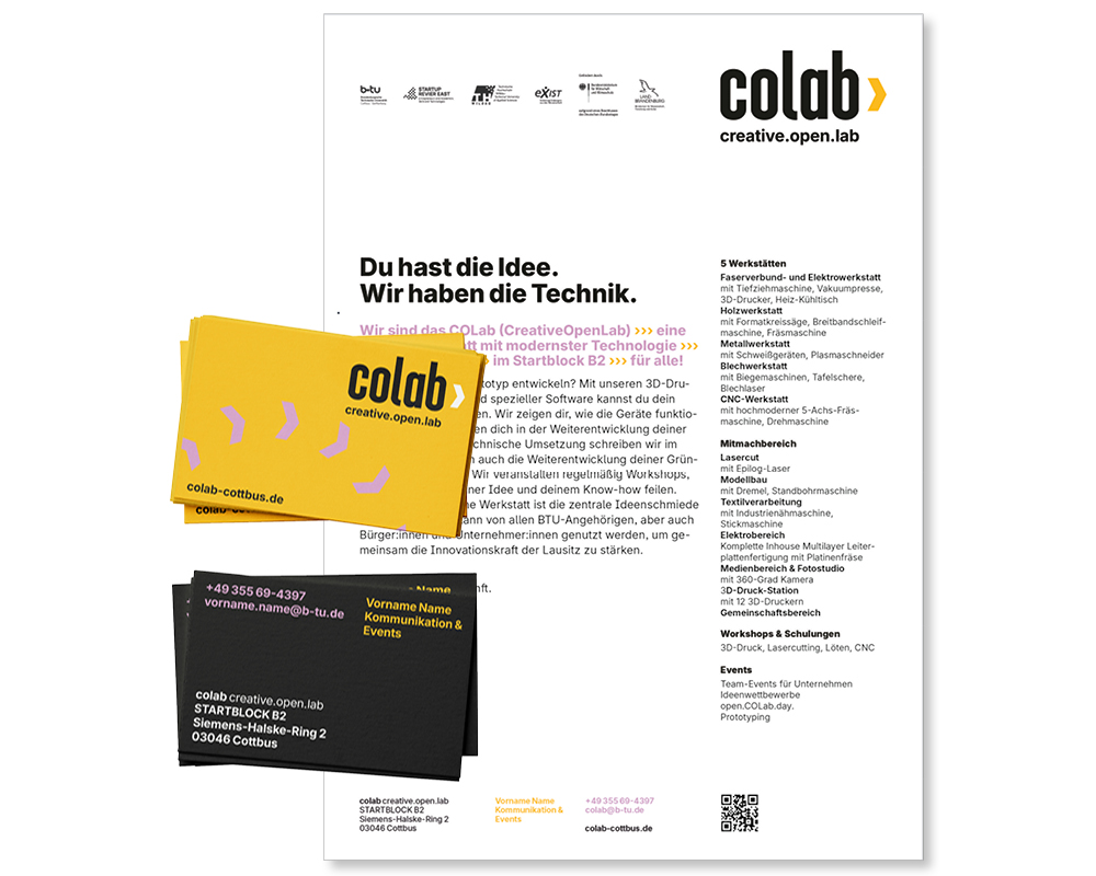 Das COLAB (CreativeOpenLab) ist ein Makerspace an der BTU Cottbus-Senftenberg. Das COLAB ist eine offene Werkstatt, eine zentrale Ideenschmiede in der Region und kann von allen BTU-Angehörigen, aber auch Bürger:innen und Unternehmer:innen genutzt werden, um gemeinsam die Innovationskraft der Lausitz zu stärken.