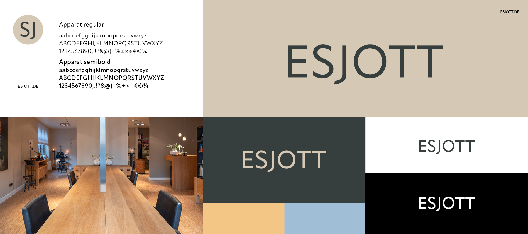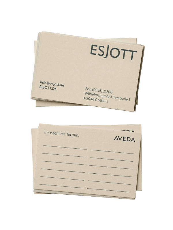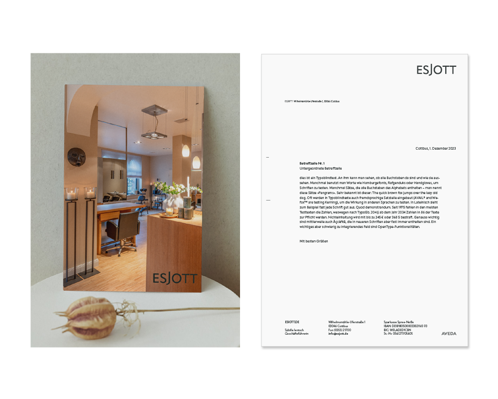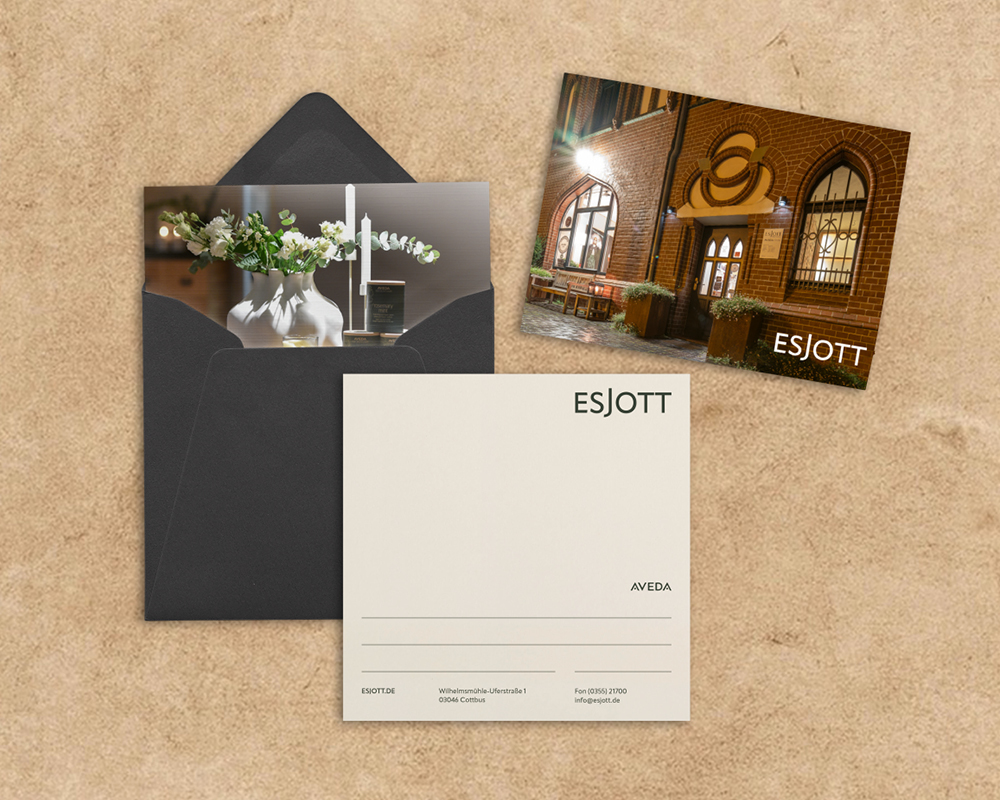2024 entwickelten wir die von uns gestaltete Marke ESJOTT und das Corporate Design des Kunden weiter, so dass es den heutigen Ansprüchen genügt. Neben der Logo-Überarbeitung gestalteten wir, passend zum Salonkonzept, auch verschiedene Materialien wie Gutscheine, Geschäftsausstattung, Aufkleber und Postkarten neu.
